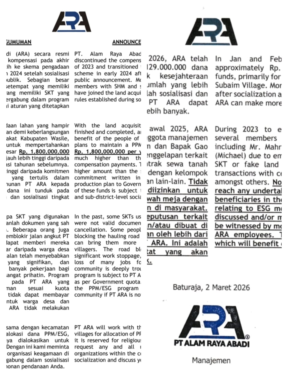 Sepanjang Januari dan Februari 2026, PT ARA telah merealisasikan sekitar Rp. 129.000.000 dana PPM/ESG, terutama untuk mendukung kesejahteraan masyarakat Desa Subaim. Perusahaan menyatakan jumlah yang lebih besar akan dialokasikan setelah proses sosialisasi dan konsultasi lanjutan, serta seiring kelancaran pengiriman sesuai kuota pemerintah.