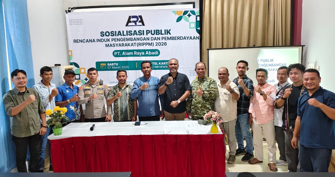 Bacanesia.com,HALTIM-PT Alam Raya Abadi (ARA) menggelar sosialisasi publik Rencana Induk Pengembangan dan Pemberdayaan Masyarakat (RIPPM) tahun 2026-2027 di Hotel Kartika, Buli Kabupaten Halmahera Timur, Maluku Utara, Sabtu (7/3/2026).